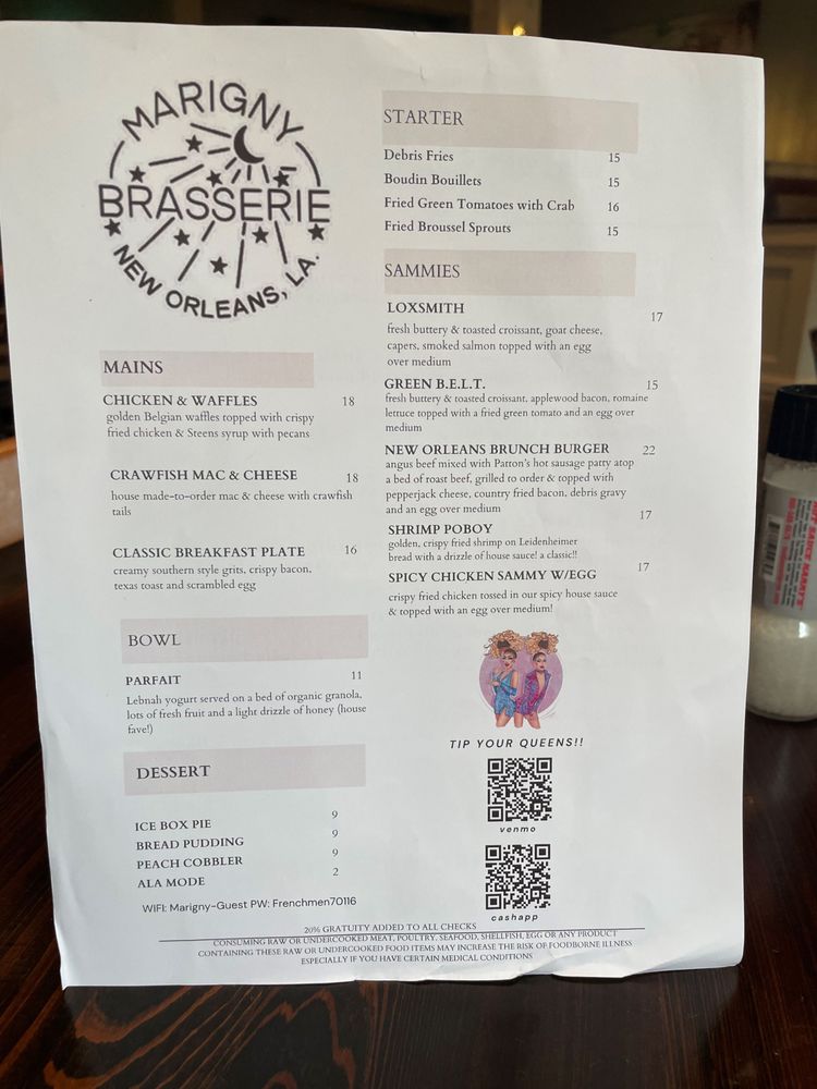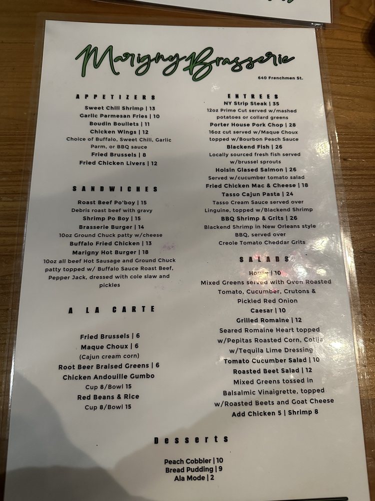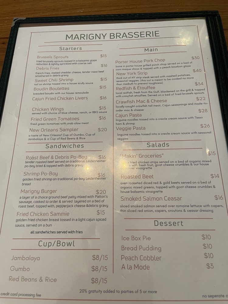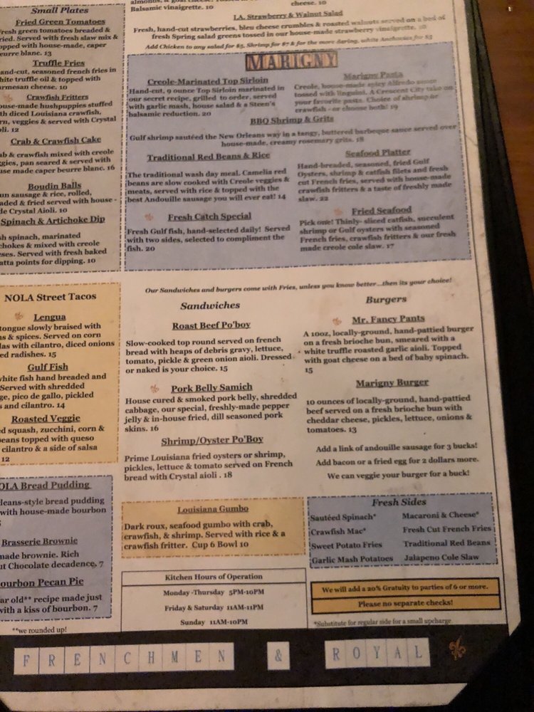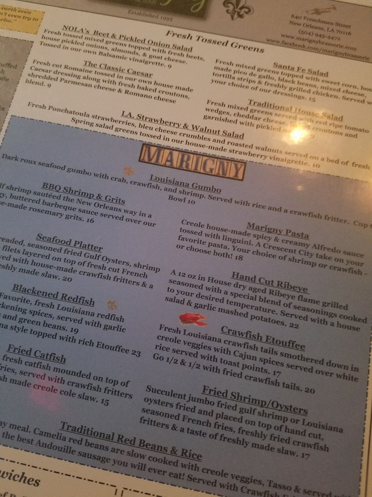 Welcome to The Marigny Brasserie, a vibrant haven tucked away on Frenchmen Street, where Cajun and Creole flavors come alive. This bar and brasserie cater to all, offering a diverse menu with pescatarian, vegan, and limited vegetarian options. Whether you're indulging in a loaded shrimp po' boy or sampling classic NOLA cuisine, each bite is a testament to the rich culinary heritage of Louisiana.